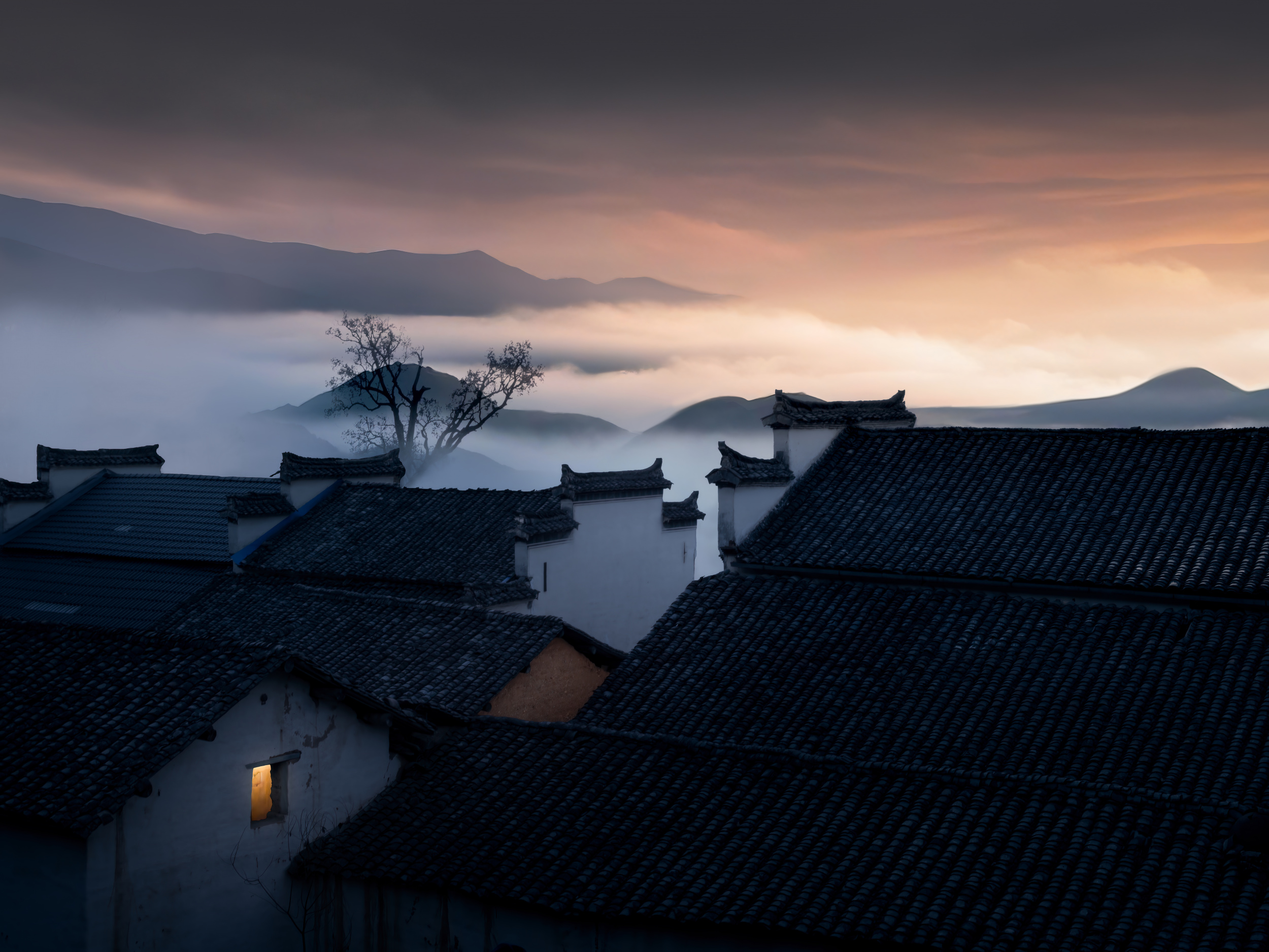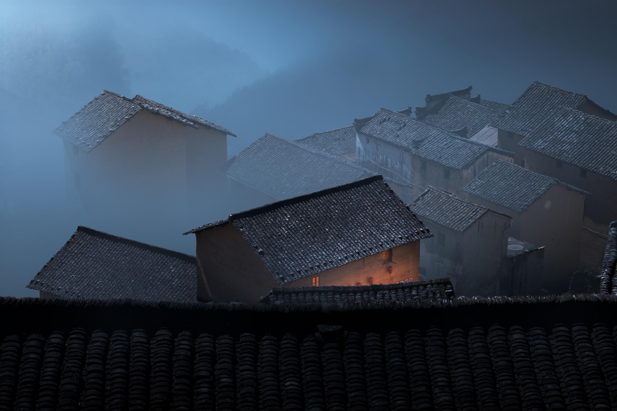 This is a photo I took of traditional Chinese architecture in Anhui Province, China. It is known as 'Huizhou-style architecture' and is characterized by its extended walls on both sides, known as 'horse-head walls'. I came across this incredibly layered and unique rooftop while walking through a high mountain village. I used my imagination to create this rather impressionistic image.