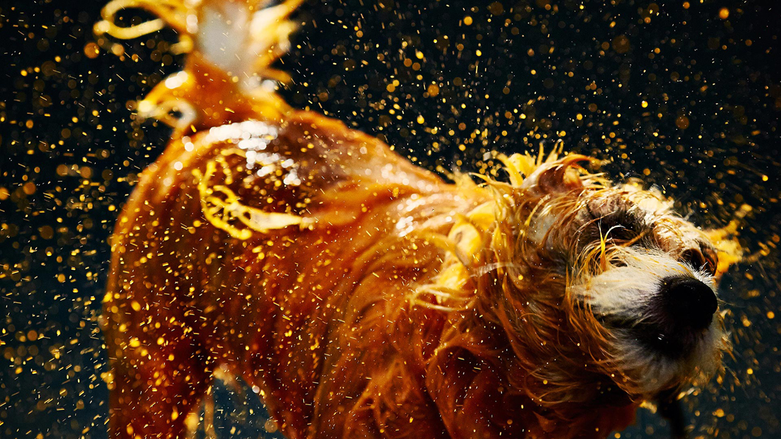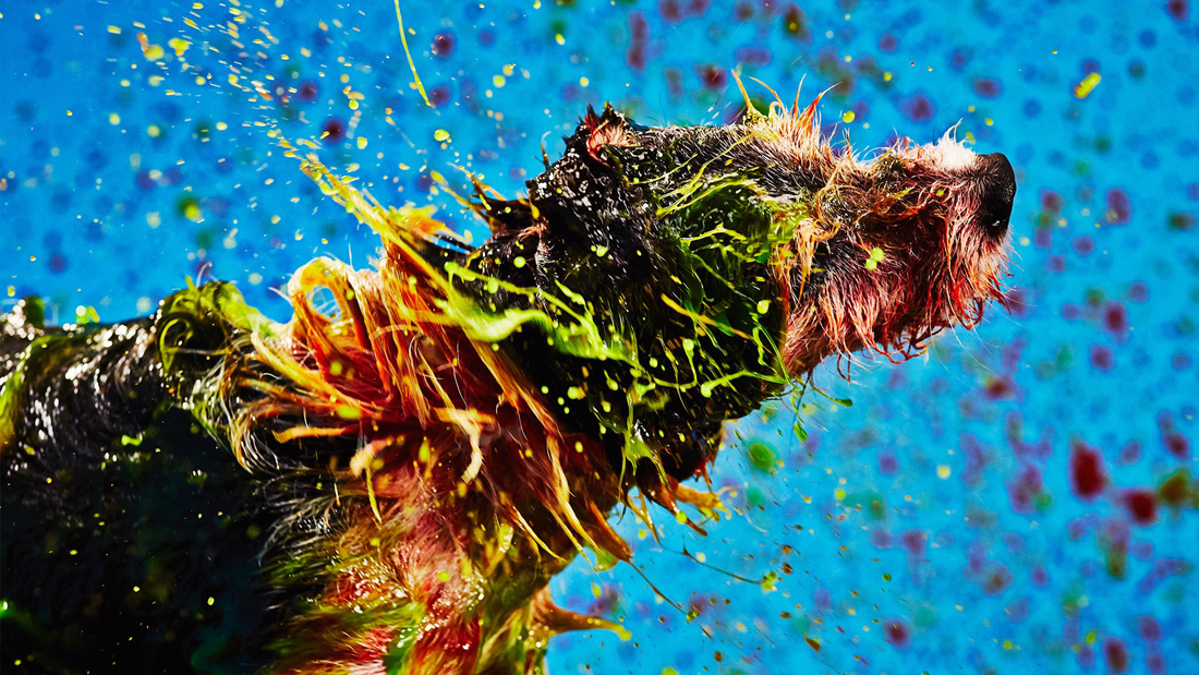 Four shelter dogs are recorded using both high-speed photography and slow-motion video as they shake off different colors of non-toxic paint. The video is being used for promotional purposes, and the photographs capture the dogs in mid-shake as the paint flies in a thousand directions.