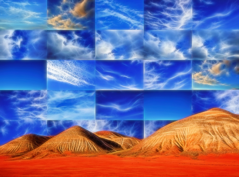 Carrizo Plain National Monument is a large enclosed grassland plain in southeastern San Luis Obispo County, California, about 100 miles (160 km) northwest of Los Angeles. It must be marvellous to be there and gaze at the mountains, the colors and the skies. And that is just what Ron Jones did. He looked around and wondered how he could show all the beauty he saw in one picture. The result of his photo montage is a mixture of the concrete and the abstract. He wanted the skies to dance, as Ron writes in the photo info. And they are indeed appearing to be dancing, these skies in the vivid, almost exuberant mosaic, thus expressing the joy Ron must have felt when roaming the plains. In this way the image is successful. But I wonder, haven’t there been other possibilities to express these feelings of joy and happiness?