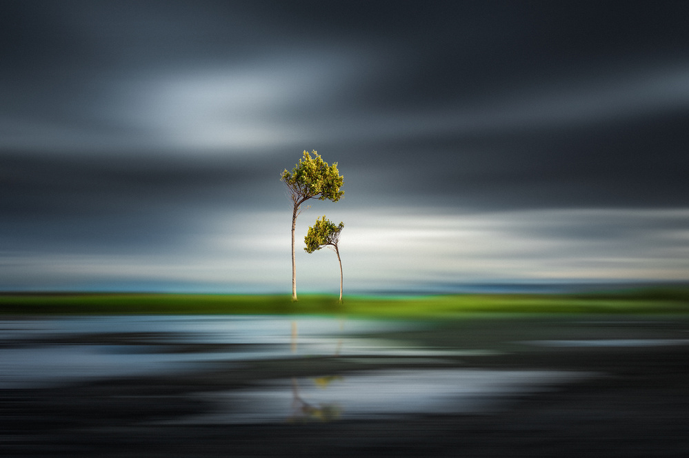 In his photograph "Family" José Antonio Sánchez attempts to wrap his surreal message into the aesthetic of the Romantics. The dark, threatening clouds, the reflection of the trees in the water, the play with the light, are all elements of the Romantic era.. The photo gets its surreal touch by its message and its supernatural reality. The landscape becomes a dreamscape with two trees on a green meadow lost between water and clouds, possibly the sole survivors of a flood or other catastrophy. They have no eye for their problematic environment. Life goes on as it is - big brother rebuking the little one. And so, in a surrealist or Dadaist way, an inherently tragic situation is made lighter by a delightful, possibly even ironic sense of humor.