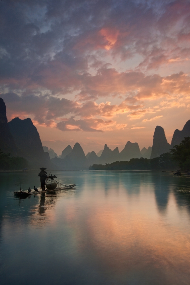 The sun rose from behind the surrounding mountains and the Li River was bathed in the first light of the day. The pink, purple and orange hues from the clouds above were reflected in the calm water and welcomed a lone fisherman to his daily work. This scene was captured after many visits to the same location, and only after a break in what had been weeks of bad weather.