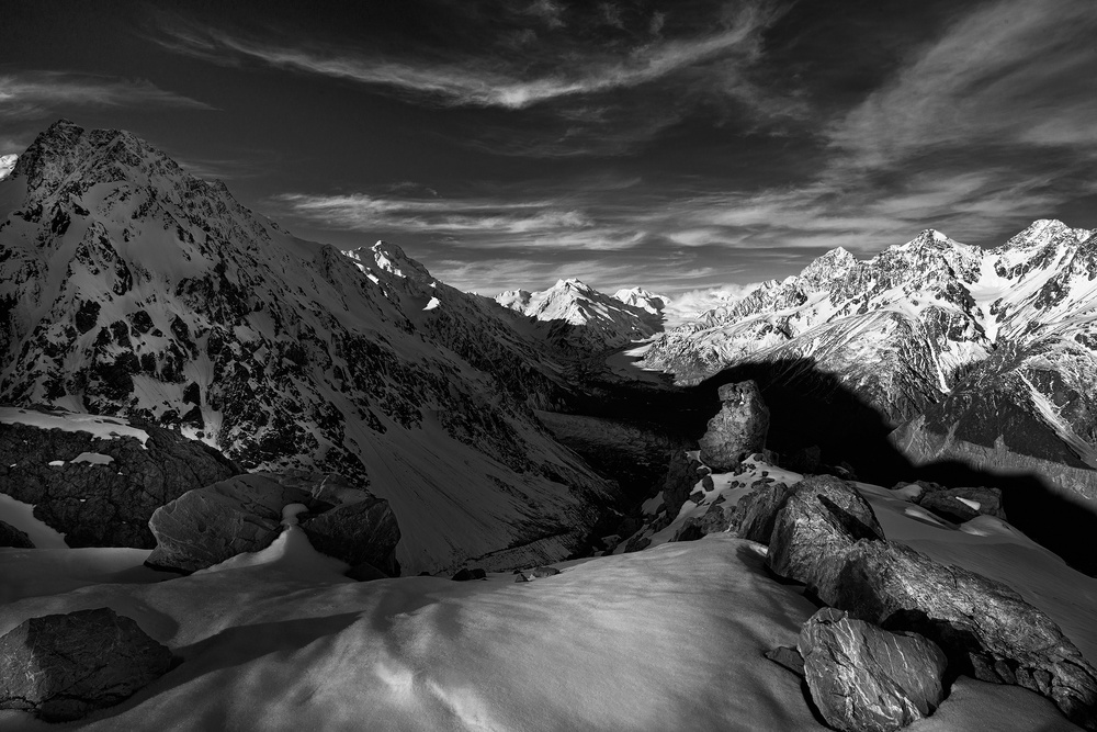 The photograph above was taken in Ball Ridge, Mount Cook. I climbed to this location, 1800 meters above sea level, with my mountain companion on 7 November 2014. After we had set up our tent, I started to explore the surrounding area. The sun was still very high, but the sunlight had already projected shadows from the left side of the mountain peak, right across to the other side of the glacier face. The foreground of rocks on the right was just outside the shadow border with a front standing rock framed by the shadow behind.