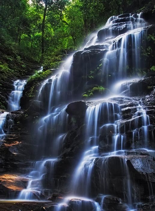 The waterfall image shown above is an example of a shot taken where the sunlight is directly overhead. This is Sylvia Falls located in Blue Mountains, New South Wales, Australia. This waterfall is surrounded by forests and is only exposed to sunlight during midday for one or two hours depending on the season. I have been to this location many times to photograph the waterfall. Only those images I took during midday at this location were appealing enough due to the sunlight highlighting the spray of running water.