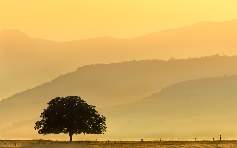 From the very first moment I saw that minimalism, my attention was attracted by the unusual upright format as well as the elegantly shaped, curved silhouette of the hill and the three trees. Their tops are just within the area spanned by the silhouette line. The warm colours and the light are simply perfect for me.