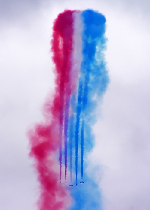 Don’t despair if it rains! Many of the regular display teams still fly in poor weather, the displays will be lower and rain (provided it isn’t too persistent) means that the skies are usually more dramatic and vapour trails are more likely to form at the wingtips. Cumulus clouds against a blue background are good too. In both cases, look for interesting cloud formations and wait for aircraft to move into them. You actually have more control of the picture elements than you might have thought!