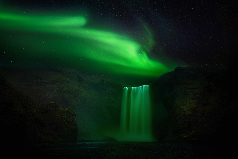 It's a pleasure to see work of a very successful 1x member here in "Critique". And what you present us is of course a deliberately processed shot. I assume we're all photographers here, so pictures like these are explored in very detail immediately, because hardly somebody believes you've found the situation and light exactly like that. I've been to Iceland myself and experienced very bright Auroras, still the very bright, almost white edge of your Skogafoss top does not make much sense.