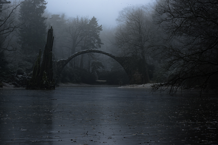 I noticed this place on 500px a couple of years ago, the real name is Rakotz Bridge. It’s very obvious why photographers love it and I wanted to have it, too. It’s not exactly close to my home, Munich, it’s a 400km drive. Starting from Munich, it’s not really possible to be there at sunrise without starting in the middle of the night. My girlfriend, photographer herself (many things I do wouldn’t work if she was not), had some business in Goerlitz, a neat town close to it, literally on the Polish Border. It was December, and most of the really good pictures of this bridge were done in autumn, golden leafs, the dreamy version. But honestly, does the surname “Devil’s Bridge” remind you of something neat, harmonic, like most pictures are? I loved the idea of doing it in winter, morning dusk, dark and mystical. So we decided to get that bridge finally.