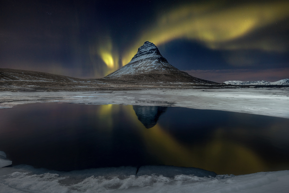 The lake in the foreground would make nice frame if entirely in the frame with maybe some rock or snow texture (not sure what is there on this location). The aurora lines could also maybe be spread out a bit wider in the frame to balance the mountain in the centre.