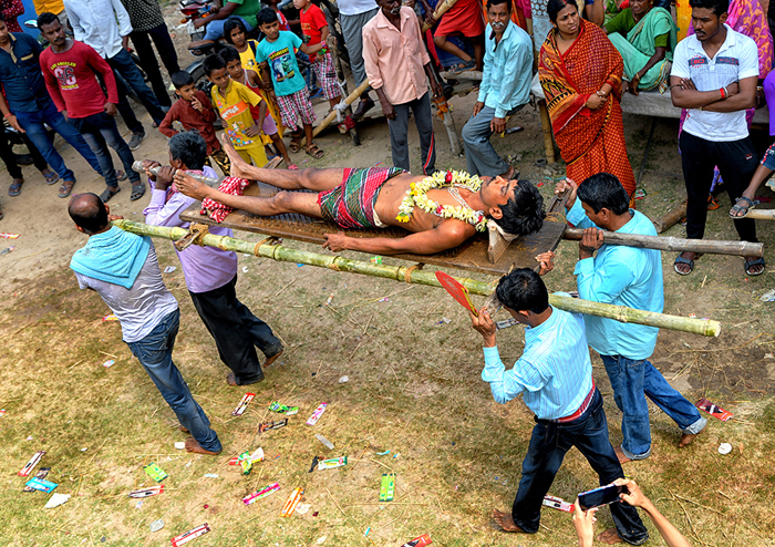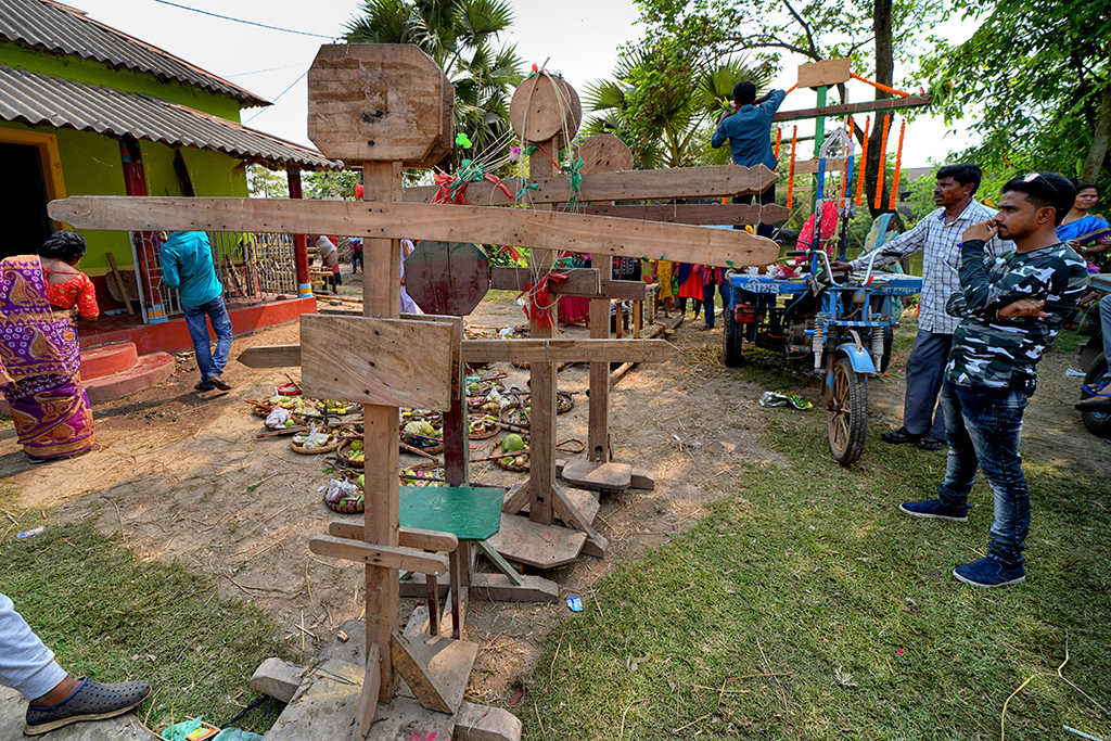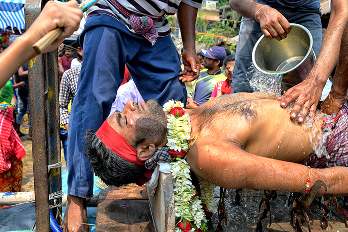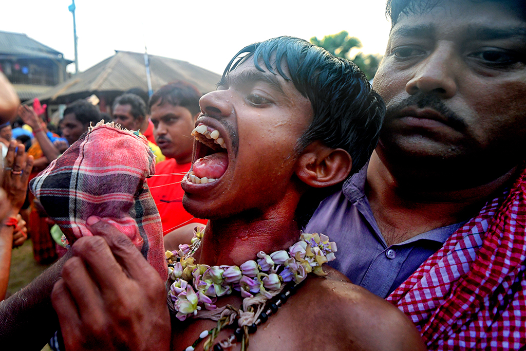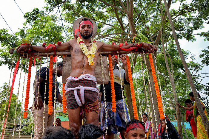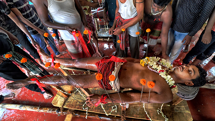 This photo story has been made during the celebration of the Gajan festival in a remote village of Hooghly district of West Bengal. The unique features of this celebration is that here villagers pierce iron rod in their body, tongue and crucify themselves by laying down on wooden framework with huge nails fixed on it.