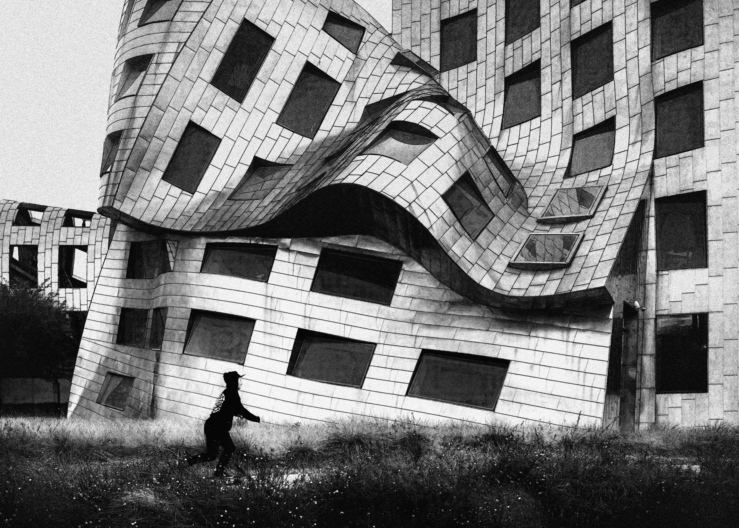 Maybe the “Birds of Peace”. Pigeons are called the birds of peace but on this picture we can see those birds flying around in chaos.  But watching carefully the photo, one can see a boy laughing inside the bus which shows a sense of humour. The black and white tones on the birds are reflecting light and shadows.