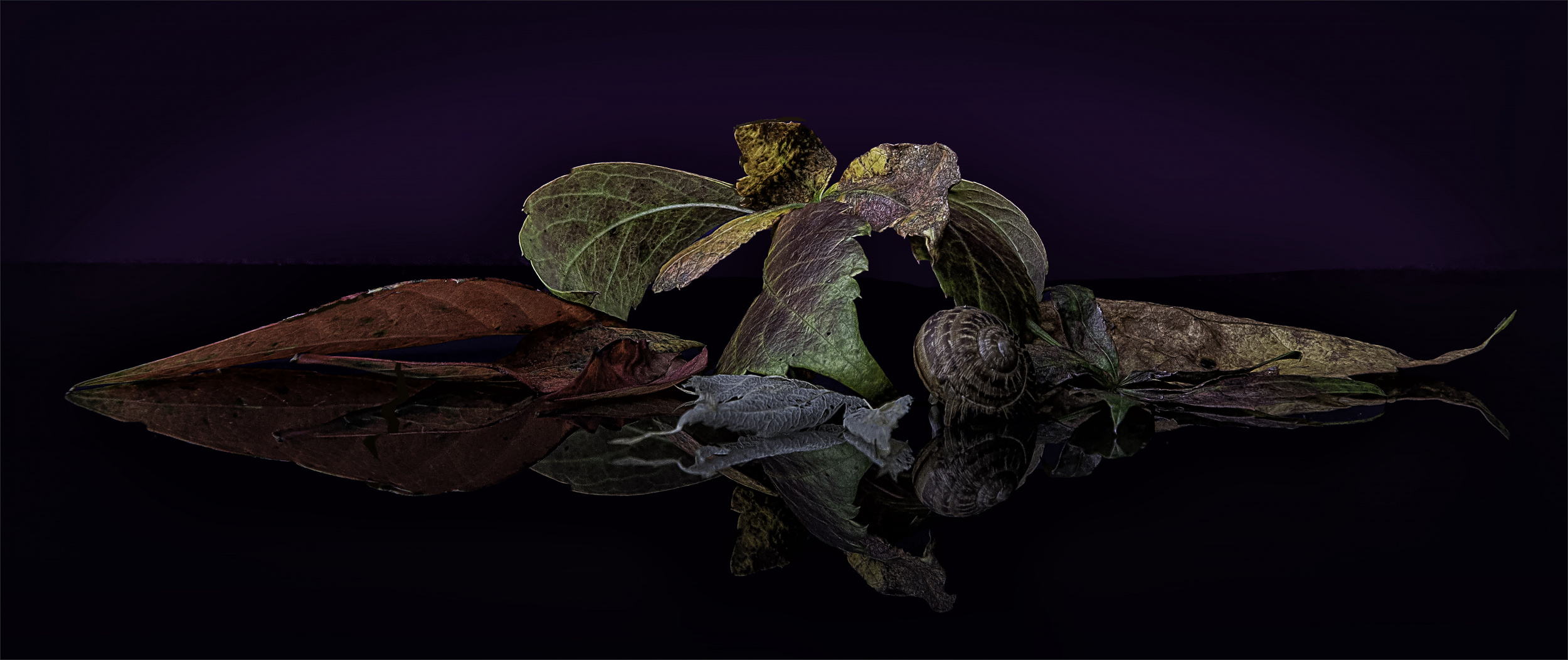 Lourens Durand was anonymously selected by judges for his photograph 'Fantasy Shapes', entered into the Creative category of the Open competition. Fantasy Shapes is a close-up photograph of an arrangement of dry leaves and a snail shell on a black tile.