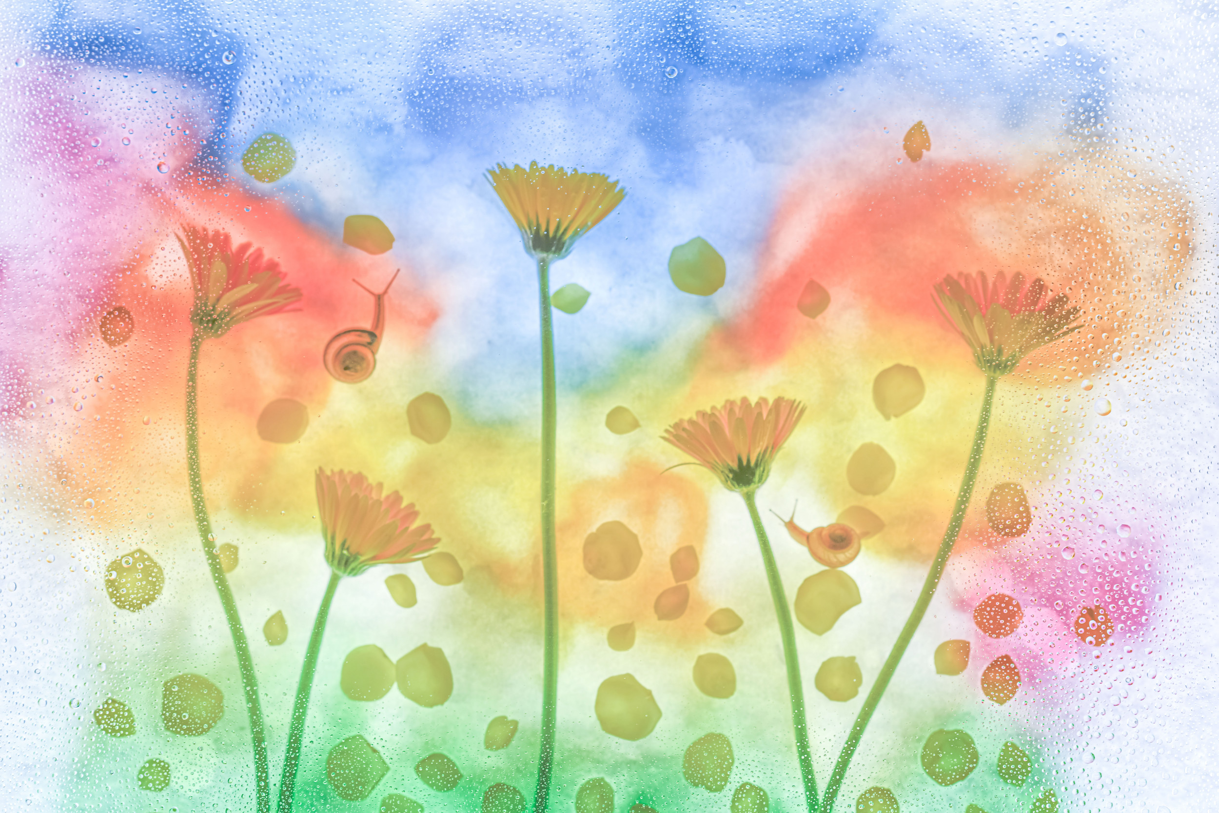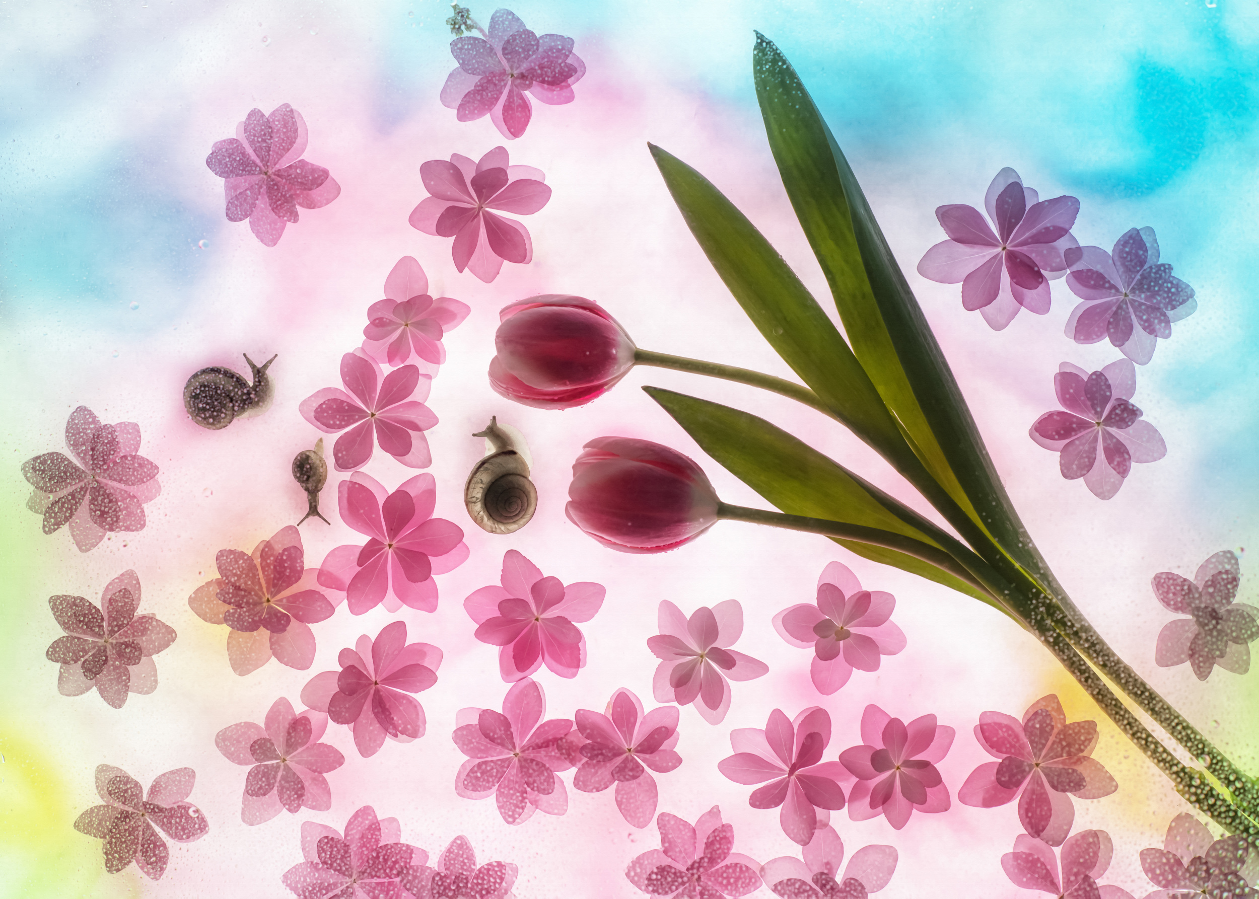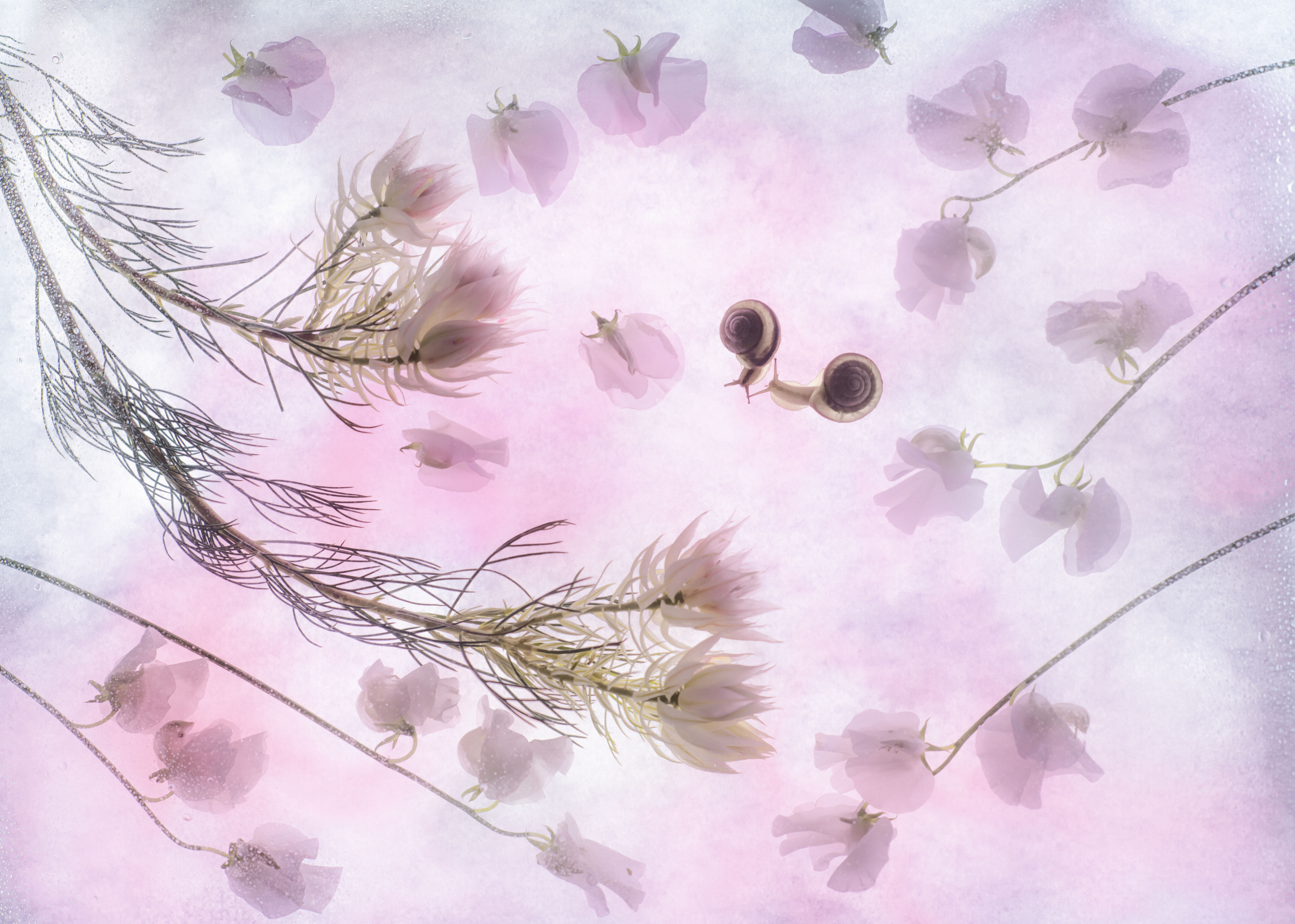 Then, when school was closed, I started creating flower art pieces to show them. I wanted to create something coming from a fairy tale world with flowers and snails that I was raising home.