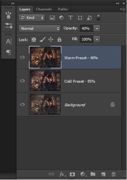 2) I tried some presets on it, but none of them worked out, so I changed the file to a PSD and tried the presets in Photoshop. I have some old favorites, although I don't recall where I found them. I edited and renamed them long ago, but they match my style. Two of them looked great: one was warm with strong contrasts, while the other was cold with a hazy feel, so I put fire and ice together. I opened the previous PSD file again, applied both of the presets and copied the layers to one file, ending up with three layers in Photoshop.