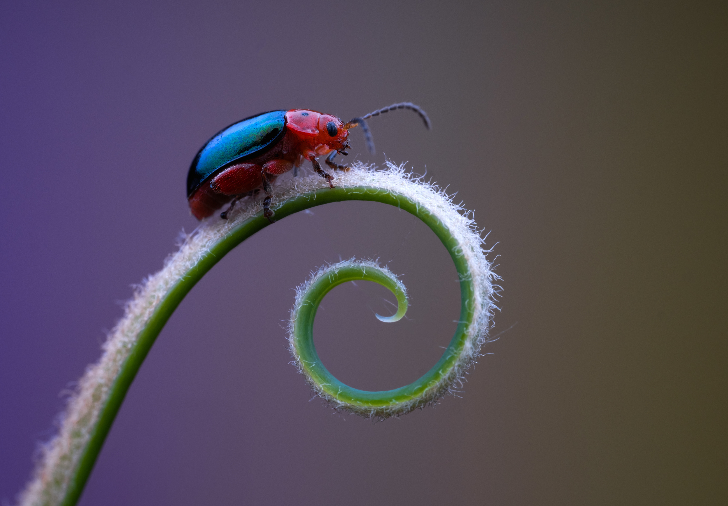 The photo 'shiny flea beetle' was taken in the park. I noticed that the leaves of a plant were full of large and small holes. Upon closer inspection, I found several insects with red and blue stripes on their bodies; the blue parts shone with a metallic lustre. Unfortunately, before I could press the shutter, they all jumped away without a trace. The next morning, I went back to take pictures again. The leaves were messy and not very attractive. So I placed a background behind the plant, holding a leaf in one hand to act as a stand for the insects while taking pictures with the other.